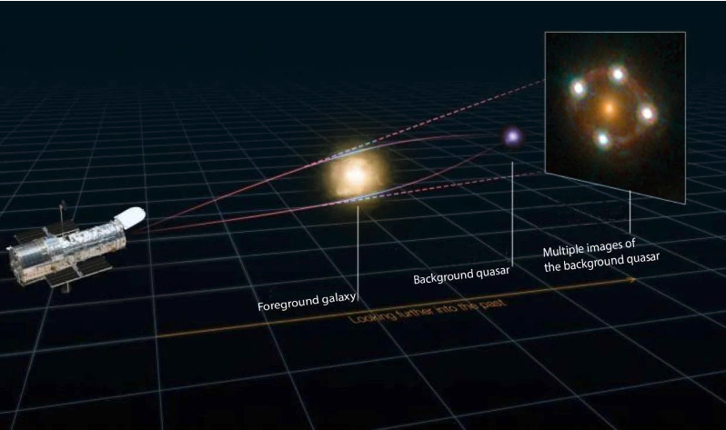 遙遠類星體發(fā)出的光,在經(jīng)過前方星系的引力勢阱的時候發(fā)生了彎曲,所以光在到達望遠鏡的時候所看到的圖片會像最右邊圖像所顯示的那樣。(圖源:Martin Millon/Swiss Federal Institute of Technology Lausanne;Hubble Space Telescope/NASA)