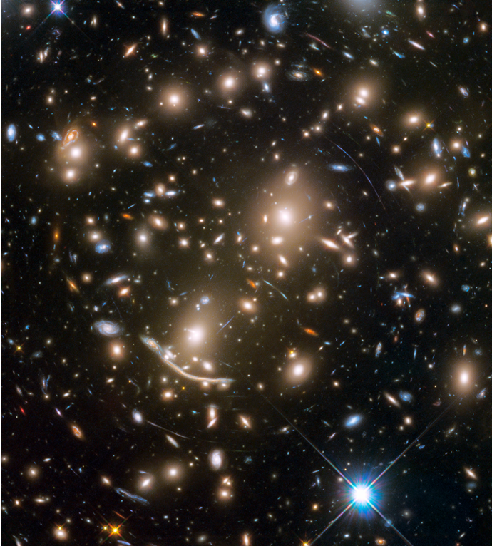 后發(fā)星系團里面觀測到的強引力透鏡效應。圖中的弧線都是背景星系發(fā)出的光被后發(fā)星系團強大的引力勢阱彎曲而產(chǎn)生的。(圖源:Hubble Space Telescope in the final Frontier Fields observations)