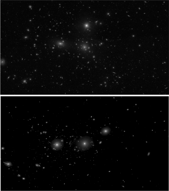 真實的后發(fā)星系團(上圖)和模擬的后發(fā)星系團(下圖)在可見光波段圖像的比較。